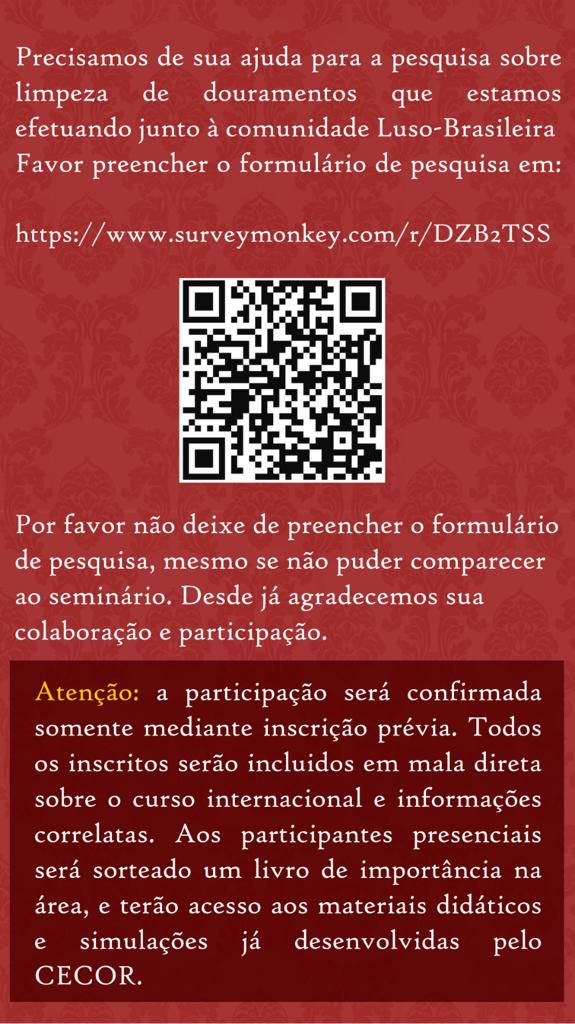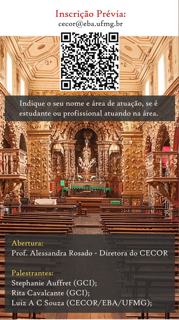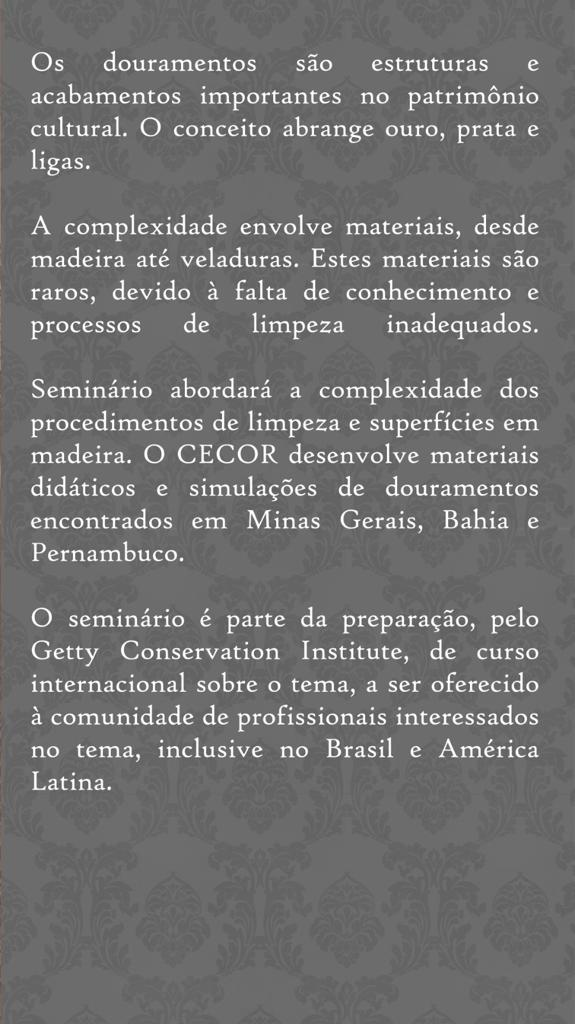 O Seminário abordará a complexidade dos procedimentos de limpeza e superfícies em madeira. O CECOR desenvolve materiais didáticos e simulações de douramentos encontrados em Minas Gerais, Bahia e Pernambuco.