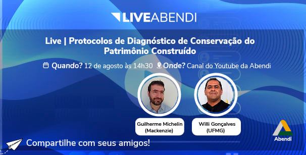 No dia 12 de agosto às 14:30 ocorrerá o evento online “Live ABENDI: Protocolos de Diagnóstico de Conservação do Patrimônio Construído”, com a participação do Prof. Guilherme Michelin, da Universidade Presbiteriana Mackenzie, e do Prof. Dr. Willi de Barros Gonçalves, prof. do curso de Conservação e Restauração da Universidade Federal de Minas Gerais.