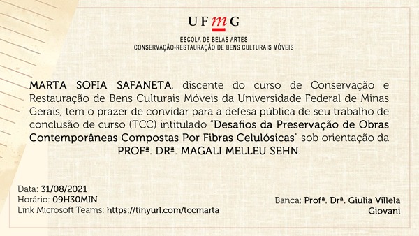 A aluna do curso de Conservação e Restauração de Bens Culturais Móveis da UFMG, Marta Sofia da Fonseca Safaneta, convida para a defesa de seu Trabalho de Conclusão de Curso da graduação, com o título “Desafios da Preservação de Obras Contemporâneas Compostas Por Fibras Celulósicas” no dia 31 de agosto, às 9:30, a ser realizado por meio da plataforma digital microsoft teams.
